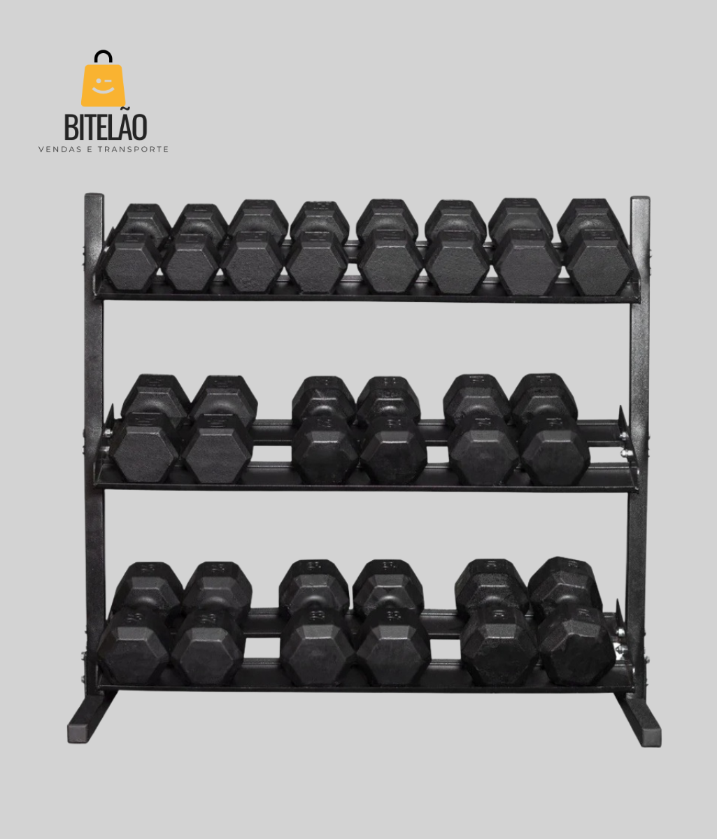 Formato hexagonal que impede completamente o rolamento dos halteres quando apoiados no chão, garantindo máxima segurança e praticidade durante os treinos.